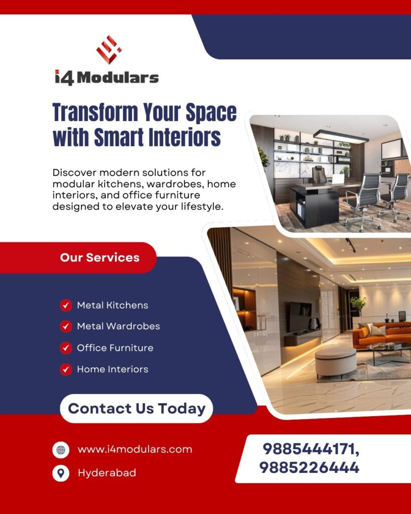I4 Modulars is a leading modular interior design and manufacturing company in Hyderabad, specializing in modular kitchens, wardrobes, home interiors, and office furniture.